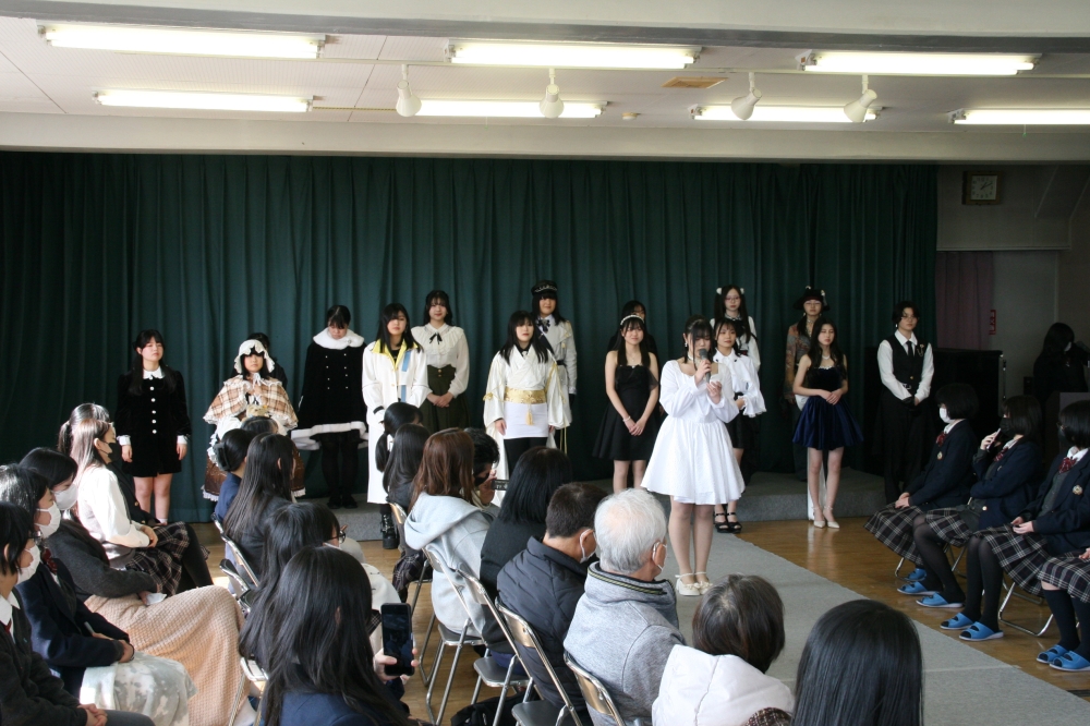 1年間の洋裁授業のまとめとして、自分がデザインして縫製した洋服を着てランウェーを歩きました。多くの保護者が来校され、成長した我が子の様子を微笑ましくご覧になっていました。