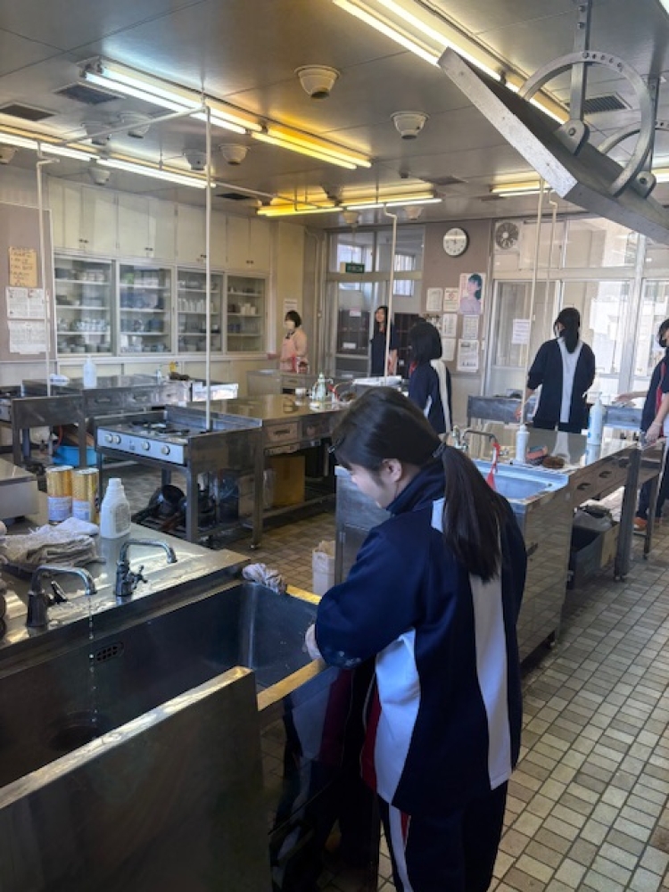 1年間使った教室や調理室などを感謝の気持ちを込めて、生徒全員で清掃しました。水は冷たかったですが、床までピカピカにしました。